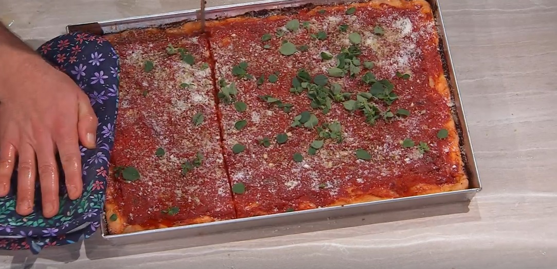 Cuociamo in forno caldo e statico a 250° per 25 minuti. All’uscita dal forno, spolveriamo con il pecorino grattugiato e l’origano fresco e secco, abbondante.