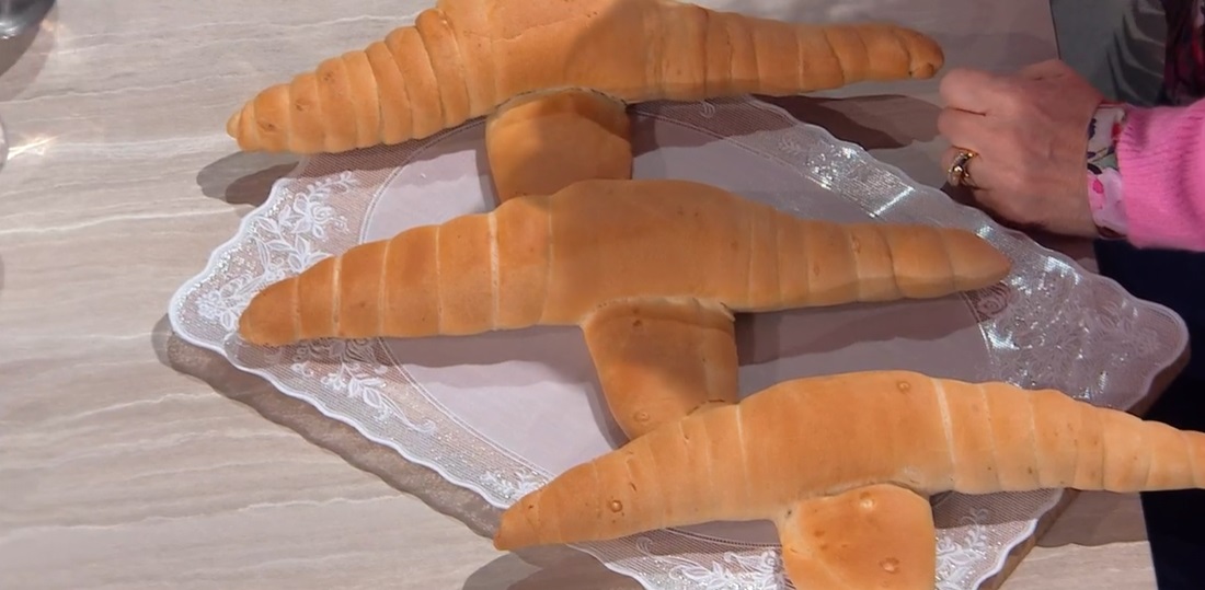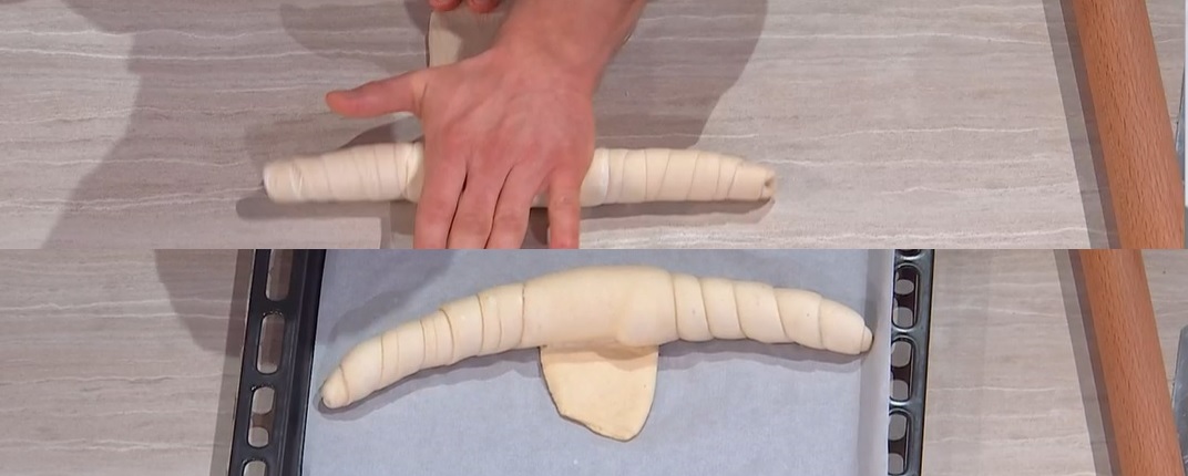 Dividiamo l’impasto in 3-4 parti. Stendiamo ciascuna in modo da ottenere un lingua lunga e sottile. Arrotoliamo quest’ultima su se stessa, ben stretta, schiacciando man mano con il palmo della mano al centro del filone (foto). Alla fine, lasciamo una linguetta. Posizioniamo i pani sulla teglia con carta forno, copriamo e lasciamo lievitare ancora 2 ore a temperatura ambiente.