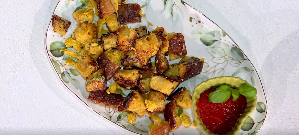 In una ciotola rompiamo le uova intere, uniamo il basilico sminuzzato, saliamo e pepiamo e sbattiamo con una forchetta. Passiamo i dadini di pane abbrustolito nel composto di uova, quindi li rimettiamo a cuocere nella padella antiaderente. Lasciamo rosolare fino a fare asciugare l’uovo e formare una crosticina dorata. Li serviamo con una classica salsa di pomodoro.