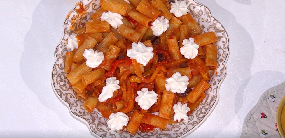 rigatoni con salsa ai peperoni di zia CriA chiudere il ricco menu di oggi, arriva una scatenata zia Cri. La cuoca romagnola, dopo aver giustificato una frequentazione sospetta, propone i rigatoni con salsa ai peperoni.