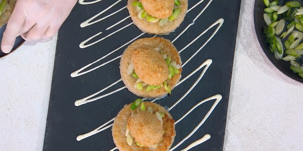 Serviamo il riso al salto con sopra gli asparagi e l’uovo fritto. Completiamo con la salsa al caciocavallo.