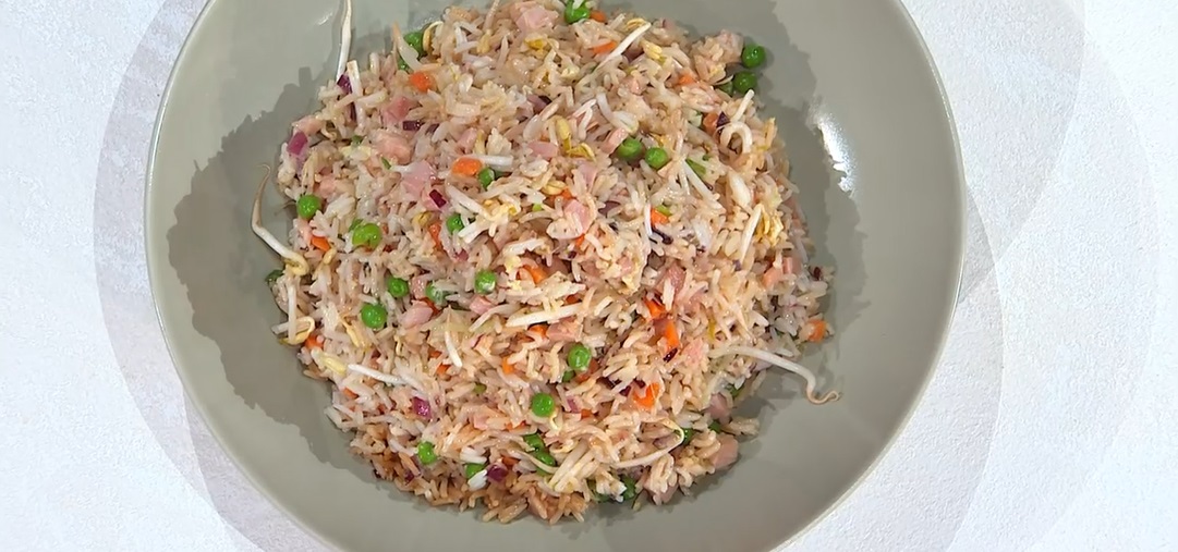 - 350 g riso basmati, 150 g prosciutto cotto, 100 g piselli, 2 carote, 1 cipollotto, 1 cipolla rossa, 2 uova, 1 cucchiaino di dashi, 30 ml salsa di soia, germogli di soia, olio di semi