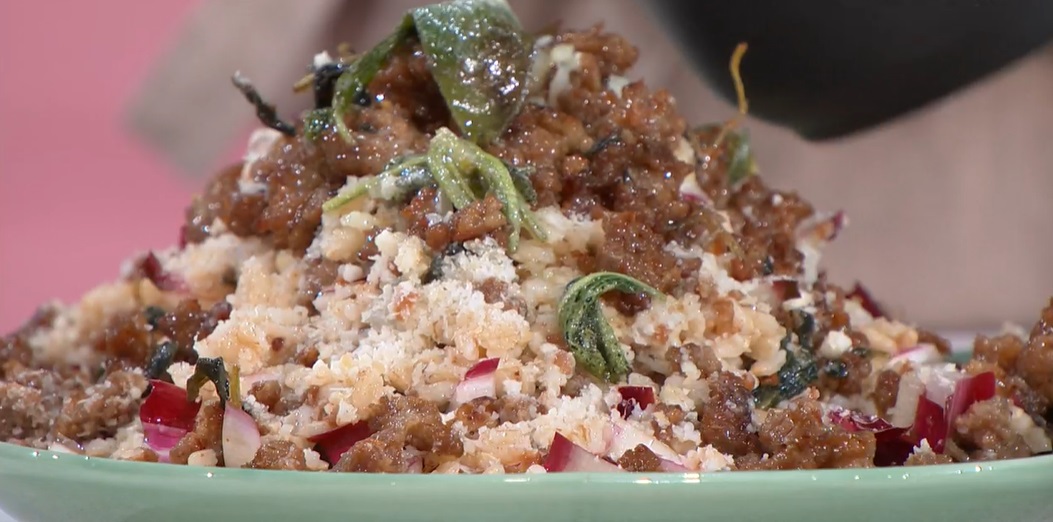 - 320 g riso semintegrale, 100 g burro, 100 g formaggio grattugiato, 1 cipolla, salvia, 1 spicchio d’aglio, alloro, 300 g salsiccia, 2 cespi di radicchio tardivo, sale e pepe