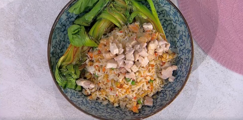 - 300 g riso basmati, 200 g petto di pollo, 3 uova, mezzo peperone rosso, 1 carota, 1 pak choi, 1 scalogno, 200 g piselli lessi, lemon grass, 1 radice di zenzero, 30 ml salsa di osia, 20 ml salsa d’ostrica, olio di mais, sale e pepe