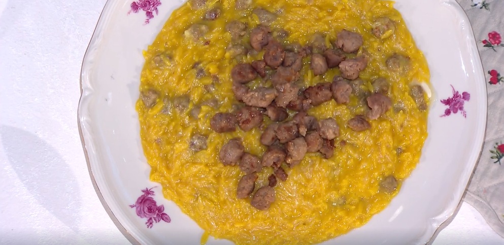 In un tegame, facciamo rosolare lo scalogno tritato con una noce di burro. Uniamo i risoni (la pasta) e la lasciamo rosolare qualche istante. Bagniamo con il brodo vegetale ed aggiungiamo lo zafferano in polvere. Proseguiamo la cottura, aggiungendo pian piano il brodo. Quando la pasta è pronta (circa 10 minuti), uniamo la salsiccia rosolata e sbriciolata. Spegniamo e mantechiamo con burro e formaggio grattugiato. A piacere, ci sta anche dell’aceto balsamico di Modena.