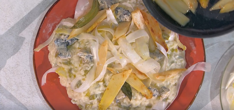 A fine cottura, mantechiamo con il burro (possiamo usare quello del fondo di cottura degli asparagi bianchi), il parmigiano grattugiato ed il gorgonzola. Serviamo il risotto su un letto di asparagi bianchi crudi, con sopra le punte di asparago bianco rosolate e del gorgonzola stagionato a dadini.