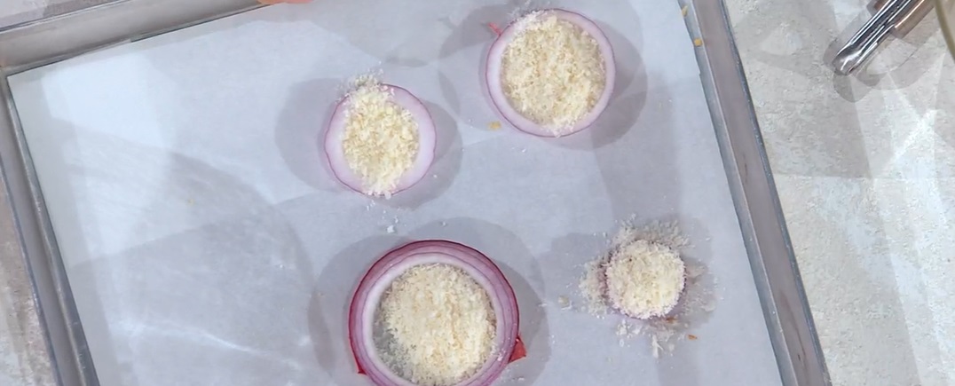 Cialde. Tagliamo la cipolla rossa a rondelle e ne ricaviamo degli anelli. Li posizioniamo su una teglia con carta forno e, dentro ogni anello, mettiamo un cucchiaio di parmigiano grattugiato. Mettiamo in forno caldo per qualche minuto, fino a far dorare il parmigiano.
