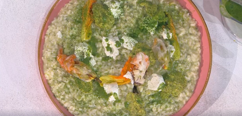Risotto: in una casseruola tostiamo il riso a secco, poi uniamo il cipollotto tagliato finemente, un goccio di olio e lasciamo rosolare. Sfumiamo quindi con il brodo e portiamo il riso a cottura, salando e pepando e profumandolo con della menta fresca. A fine cottura, mantechiamo il riso con il formaggio caprino (o altro spalmabile), la crema di zucchine e dell’olio aromatizzato alla menta (frulliamo dell’olio con delle foglie di menta). Serviamo il risotto guarnendo con fiocchi di caprino e salsa di zucchine.