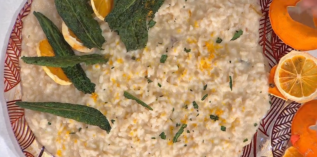 In questo venerdì insolito, in cui si cucina in diretta e non in differita, arriva l’amido di sempre, Sergio Barzetti, per preparare un primo piatto sciuè sciuè, il risotto arancia cavolo nero e taleggio.