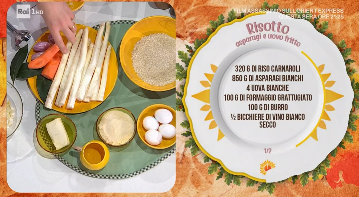 - 320 g riso carnaroli, 850 g asparagi bianchi, 4 uova bianche, 100 g formaggio grattugiato, 100 g burro, mezzo bicchiere di vino bianco, 3 scalogni, 1 carota, alloro, sale e pepe