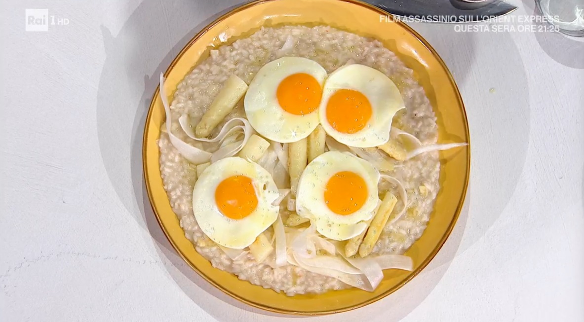 Puliamo una parte degli asparagi, quindi li immergiamo in acqua bollente per 6 minuti. Li scoliamo e li mettiamo in acqua fredda. Prendiamo le punte e le mettiamo a rosolare in padella con un a noce di burro. I gambi, invece, li frulliamo con un mixer ad immersione, aggiungendo un po’ di brodo: dobbiamo ottenere una crema.