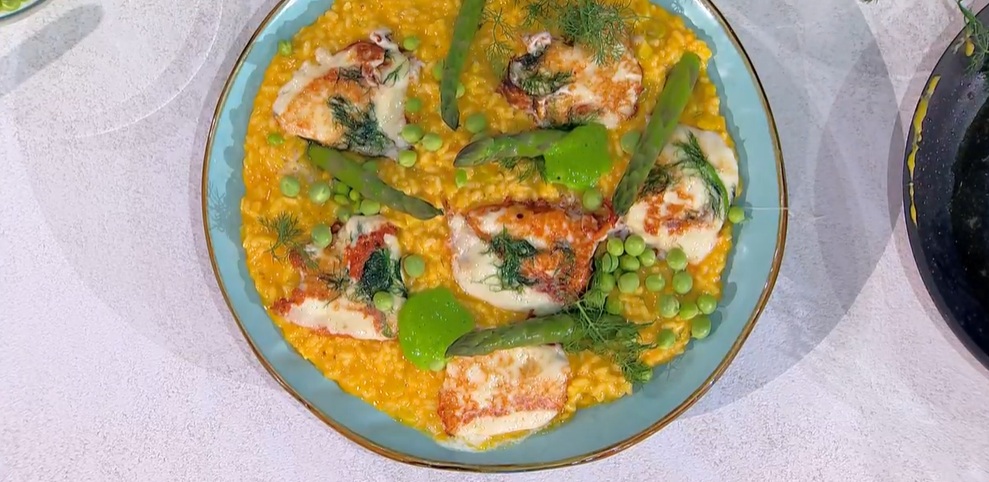 - 480 g riso Carnaroli, 400 g quartirolo, 350 g piselli, 2 mazzi di asparagi, 6 carote, 1 limone, 80 g burro, alloro, finocchietto, pepe, sale