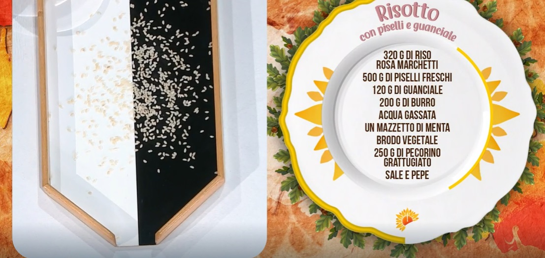 - 320 g riso Rosa Marchetti, 500 g piselli freschi, 120 g guanciale, 200 g burro, acqua gassata, un mazzetto di menta, brodo vegetale, 250 g pecorino grattugiato, sale e pepe