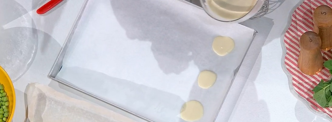 Per il secondo croccante, usiamo metà degli ingredienti della precedente, ma in questo caso aggiungiamo dell’acqua frizzante, fino ad ottenere una miscela fluida e liscia. Sulla teglia, con un cucchiaio, formiamo dei dischetti, che cuociamo in forno caldo e statico a 175° per 12 minuti o fino a doratura.