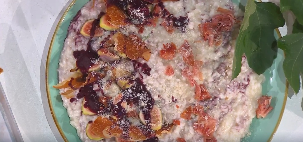 - 320 g riso, 1 cipolla, mezzo bicchiere vino bianco, 150 g parmigiano grattugiato, 100 g culatello, 200 g uva americana, 50 g burro, zucchero, brodo di carne, alloro, rosmarino, sale e pepe, fichi