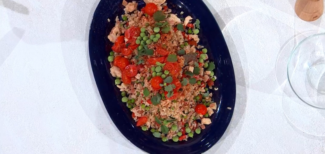 In una padella ben calda, mettiamo a rosolare il prosciutto cotto a dadini. Dopo qualche istante, uniamo il peperone pulito e tagliato a dadini piccoli e, a seguire, il pollo a dadini (piccoli come quelli del peperone. Aggiungiamo un filo d’olio e continuiamo a far rosolare a fiamma alta. Profumiamo con il prezzemolo tritato ed aggiungiamo i piselli sbollentati in precedenza e continuiamo a cuocere. Uniamo il formaggio grattugiato ed il riso e saltiamo qualche istante. Finiamo con le erbe aromatiche, la paprika affumicata e serviamo con sopra i pomodorini freschi a spicchi.