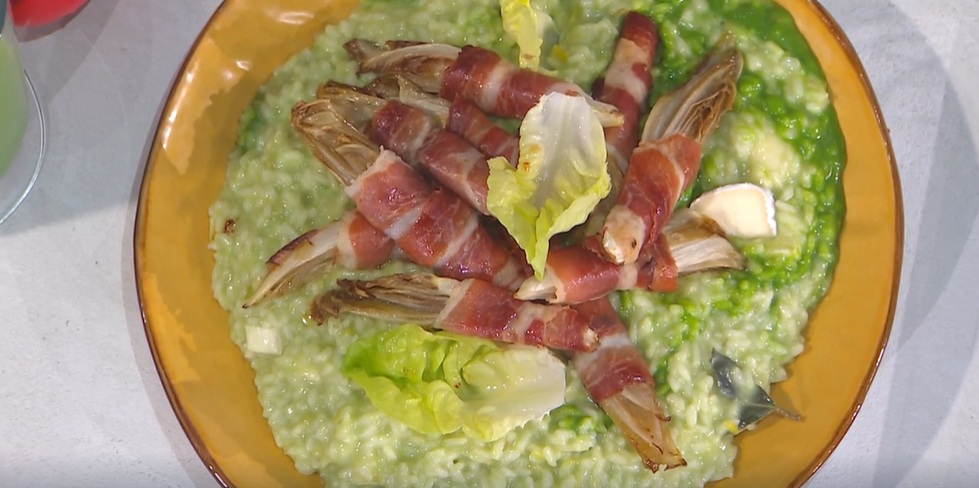 Quando il risotto è pronto, lo mantechiamo con del brie a pezzettini, del parmigiano grattugiato e la crema di lattuga. Serviamo il risotto con sopra altra crema di lattuga e l’indivia cotta in forno con lo speck.