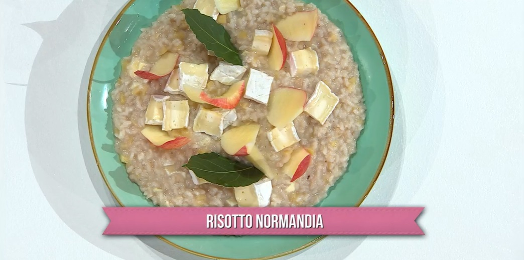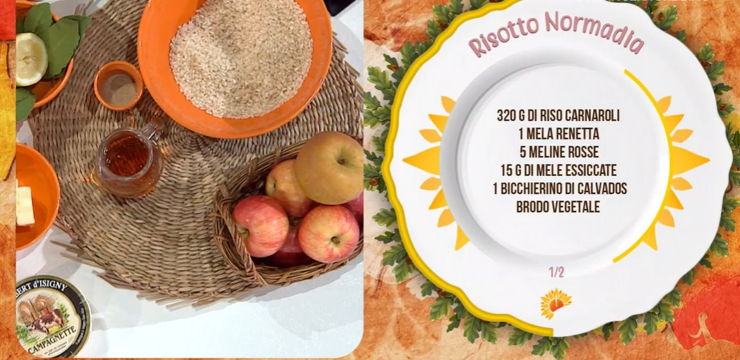 - 320 g riso Carnaroli, 1 mela renetta, 5 meline rosse, 15 g mele essiccate, 1 bicchierino di Calvados, brodo vegetale, 150 g camembert, 100 g burro, alloro, sale e pepe
