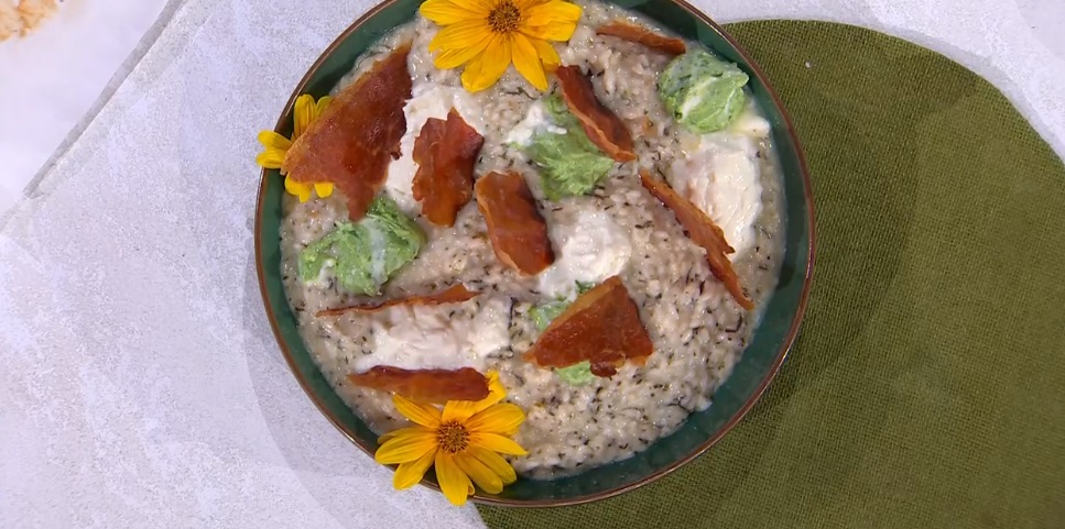 Sergio Barzetti propone un risotto che celebra la Patria del buonumore, la Romagna. Sotto l’occhio attendo di una romagnola doc, zia Cri, il cuoco lombardo prepara il risotto squacquerone rucola e prosciutto.