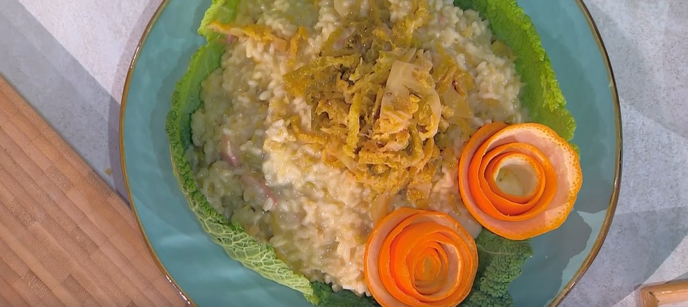 Sergio Barzetti apre la puntata di oggi con uno dei suoi golosi risotti. Il cuoco lombardo, che celebra la gioia di aver avuto una bambina in affido, prepara il risotto verza arancia e taleggio.