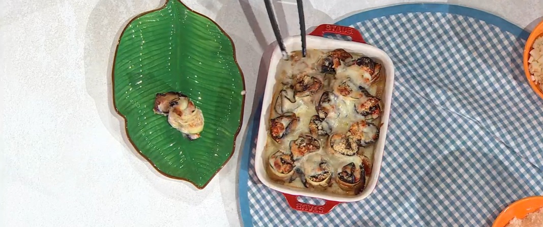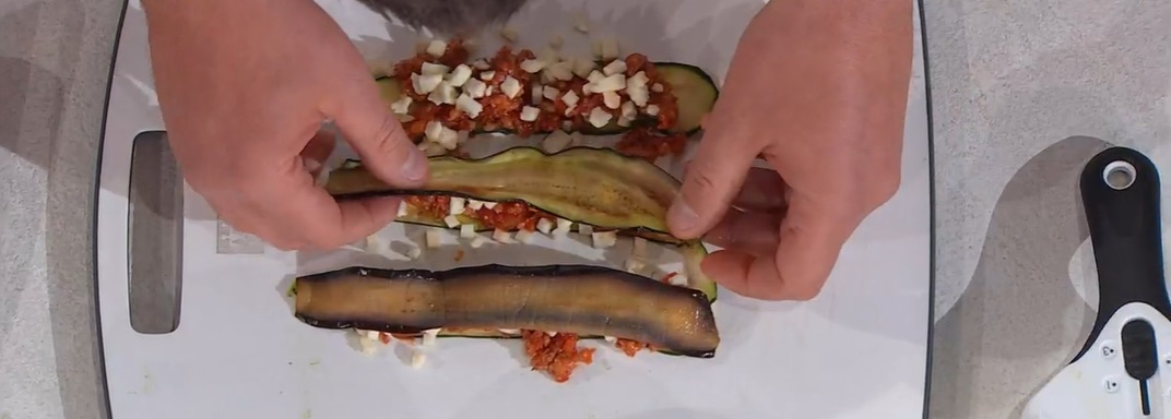 Su ogni fettina di zucchina grigliata, mettiamo un po’ del ragù e della mozzarella tritata, quindi posizioniamo sul ripieno una fetta di melanzana fritta ed arrotoliamo a formare una girella.