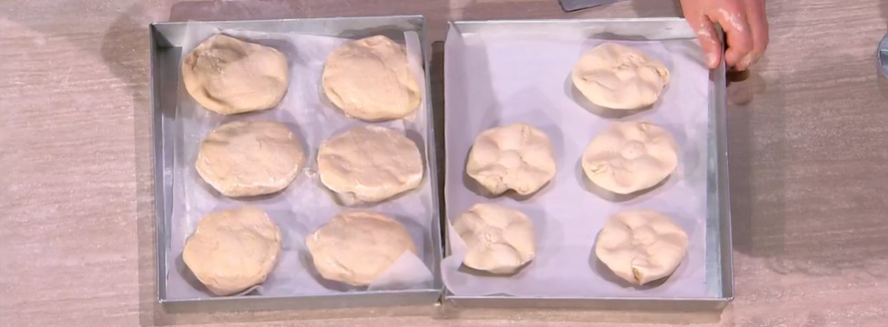 Con lo stampo o un tagliamela infarinato, pressiamo su ogni panino, appiattendolo. Li disponiamo sulla teglia, capovolgendole. Copriamo e lasciamo riposare ancora 1 ora.