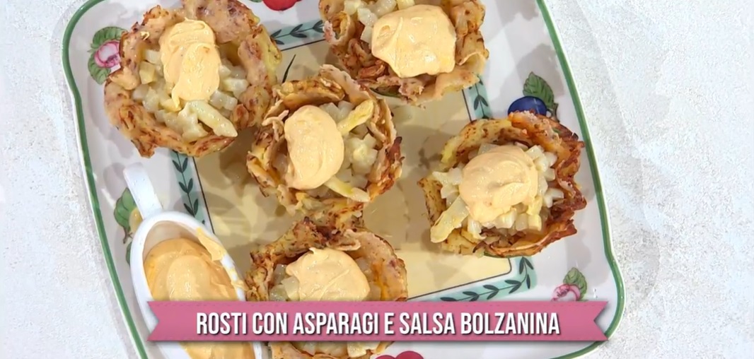 rosti con asparagi e salsa bolzanina di Barbara De NigrisBarbara De Nigris, oggi, arriva in cucina con una missione, fare contenta Evelina, almeno per una volta. Nonostante la sua cucina di montagna non sia proprio light, la cuoca altoatesina oggi prepara un piatto primaverile, ovvero il rosti con asparagi e salsa bolzanina.