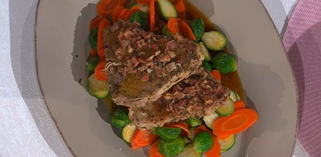 In un tegame, scaldiamo una noce di burro con dei rametti di rosmarino, della salvia e della pancetta a dadini. Mettiamo a rosolare la carne. Quando la carne è rosolata sui due lati, sfumiamo con il vino bianco e copriamo con il brodo. Mettiamo il coperchio e lasciamo cuocere per 15 minuti a fuoco vivace.