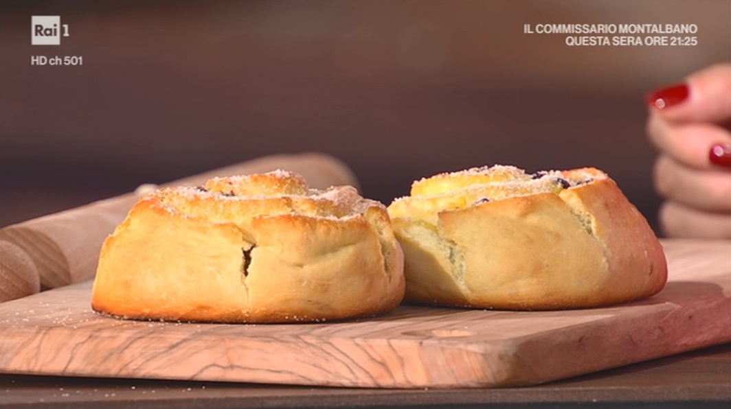 Stendiamo l’impasto con il mattarello, fino ad ottenere un rettangolo spesso circa mezzo cm. Spalmiamo sopra la crema pasticcera e distribuiamo sopra uvetta o gocce di cioccolato. Arrotoliamo l’impasto sul ripieno, partendo dal lato lungo. Tagliamo il filone ottenuto a fette spesse 5 cm circa e le disponiamo sulla teglia, rivolgendo il taglio verso l’alto. Copriamo e lasciamo lievitare ancora 1 ora a temperatura ambiente.