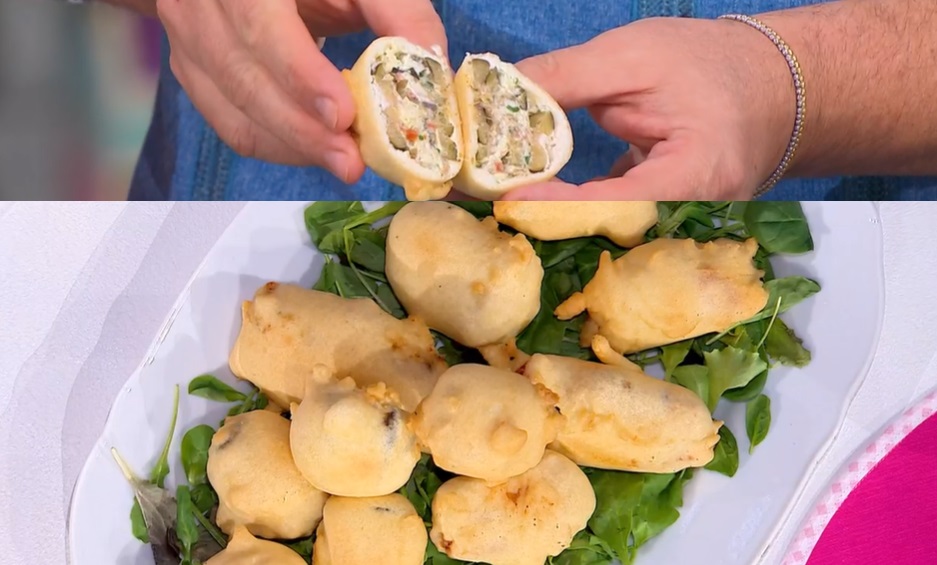 Scoliamo peperoni e zucchine sott’olio e le asciughiamo bene con della carta assorbente. Su ogni falda di peperone o fetta di zucchina mettiamo un po’ di ripieno ed arrotoliamo a formare un involtino. Passiamo quest’ultimi nella farina di riposa e lasciamo riposare 10 minuti in frigorifero. Immergiamo gli involtini nella pastella ghiacciata e tuffiamo subito in olio caldo e profondo. Lasciamo friggere fino a leggera doratura. Possiamo friggerli in anticipo e conservarli in forno caldo e socchiuso a 80° fino al momento del servizio.