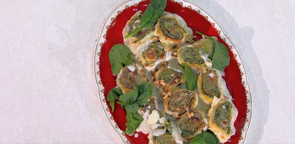 Tagliamo il rotolo a fette spesse 3-5 cm, quindi le disponiamo all’interno di una pirofila, su un letto di besciamella. Distribuiamo sopra il taleggio a pezzetti, abbondante formaggio grattugiato e passiamo in forno caldo a 200° per 20 minuti. Serviamo con delle noci e degli spinacini freschi.