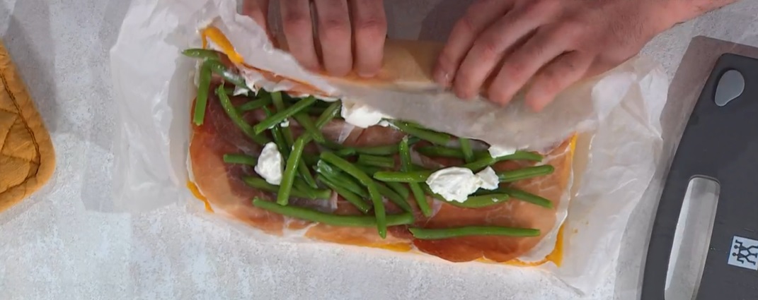 Spalmiamo sul rettangolo di frittata il formaggio spalmabile, quindi copriamo con il culatello o prosciutto affettato, i fagiolini lessi e ancora qualche ciuffo di formaggio spalmabile. Arrotoliamo la frittata sul ripieno, ben stretta, aiutandoci con la carta forno. Chiudiamo a caramella la carta forno o avvolgiamo il rotolo nella pellicola e lasciamo riposare in frigorifero qualche ora. Tagliamo a fette e serviamo con sopra il crumble e i datterini tagliati a spicchi e conditi con erbe tritate, olio e sale.