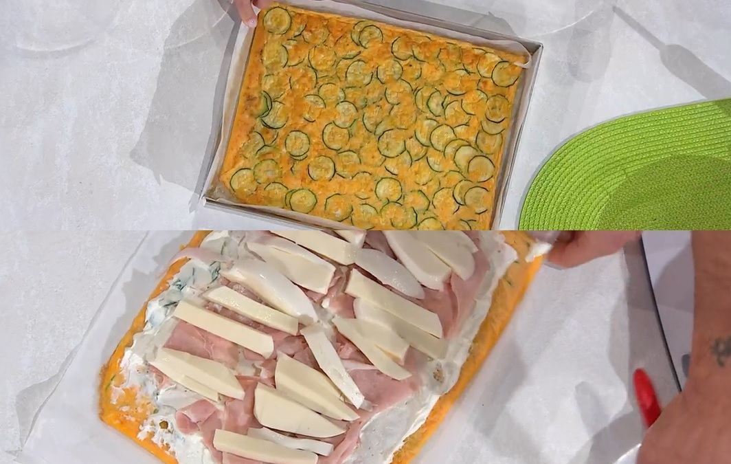 • 7 uova, 3 zucchine medie, 30 g formaggio grattugiato, 200 g robiola, 200 g rucola, 2 pomodori, 150 g prosciutto cotto, 200 g mozzarella, 200 ml olio di semi, basilico, sale e pepe, olio evo