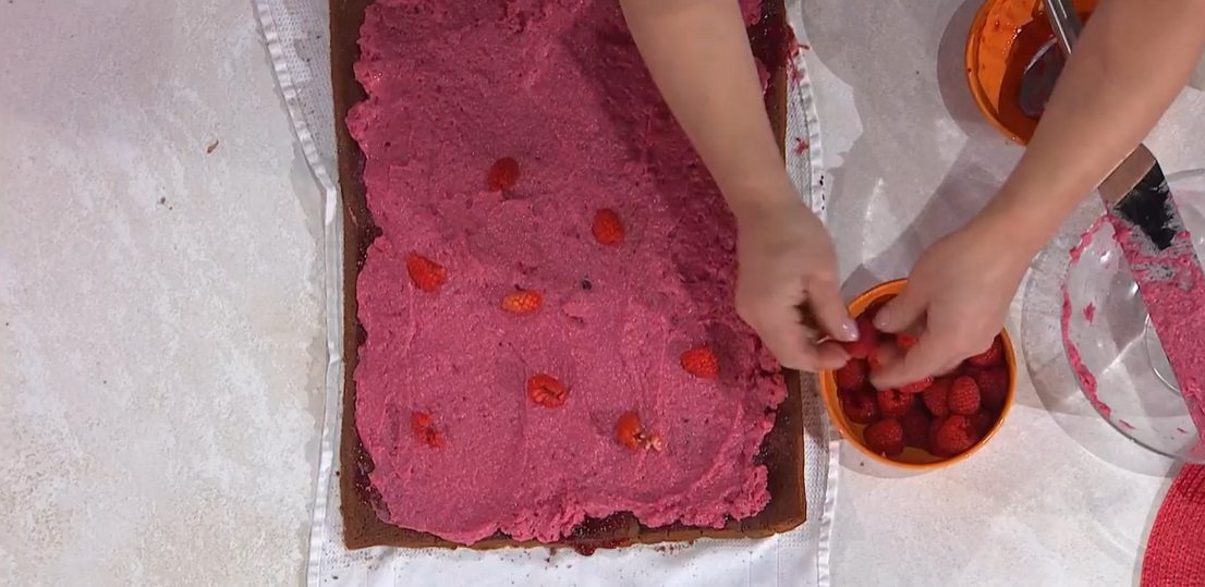 Spalmiamo sul pan di Spagna un velo di confettura di lamponi, quindi spalmiamo sopra la crema ai lamponi e distribuiamo i lamponi freschi. Arrotoliamo il pan di Spagna sul ripieno, ben stretto, partendo dal lato lungo. Chiudiamo il canovaccio a caramella e lasciamo riposare 1 ora in frigorifero. Serviamo con una spolverata di cacao amaro e spuntoni di panna montata.