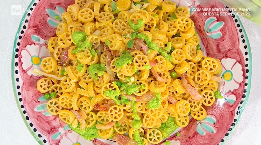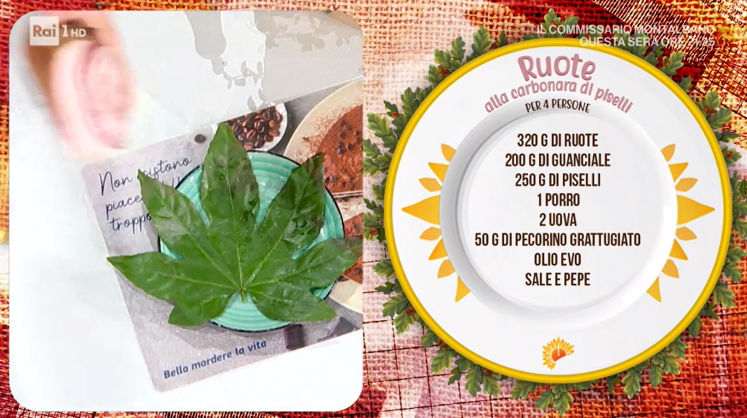 - 320 g ruote, 200 g guanciale, 250 g piselli, 1 porro, 2 uova, 50 g pecorino grattugiato, olio evo, sale e pepe