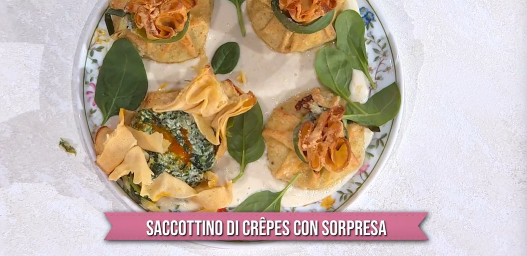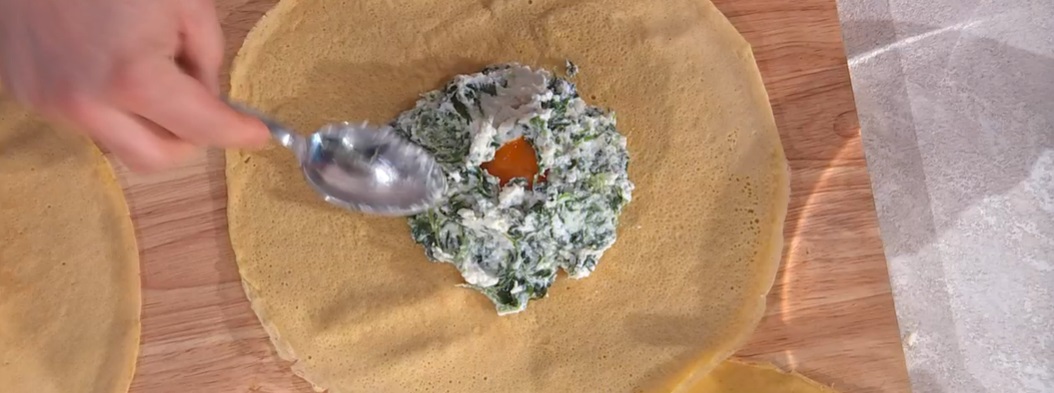 Su ogni crespella, mettiamo due cucchiaiate di ripieno di ricotta (circa 180 g), creiamo al centro del ripieno un incavo, dove inseriamo il tuorlo crudo. Copriamo quest’ultimo con un po’ del ripieno. Richiudiamo i lembi della crepe sul ripieno, legandoli con una strisciolina di porro o con uno stuzzicadenti.