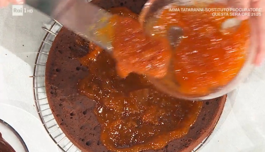 Tagliamo la torta a metà, quindi la farciamo con la confettura di albicocche. Posizioniamo la torta su una grata e coliamo sopra la glassa, facendola scendere uniformemente anche sui bordi. Decoriamo a piacere.