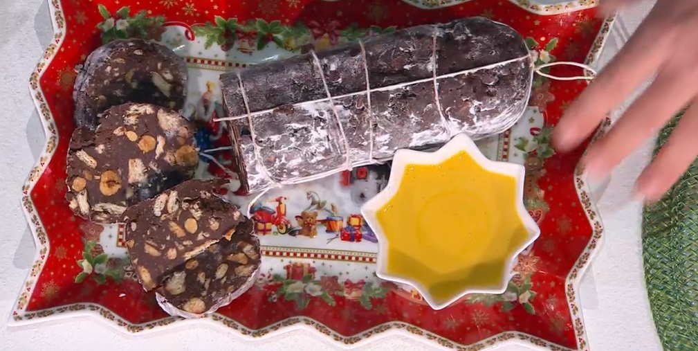 Anche questa settimana, la prima di dicembre, si apre con il dolce di Daniele Persegani. Il cuoco emiliano, in vista delle feste e del compleanno di Antonella, propone un dolce amato da grandi e piccini, un classico: il salame di cioccolato.