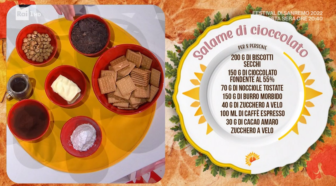 Una ricettina sciuè sciuè per Zia Cri, da gustare guardando il festivalone, mai come quest’anno tanto seguito. Oggi, in particolare, la cuoca romagnola prepara un classico della pasticceria casalinga, il mitico salame di cioccolato.