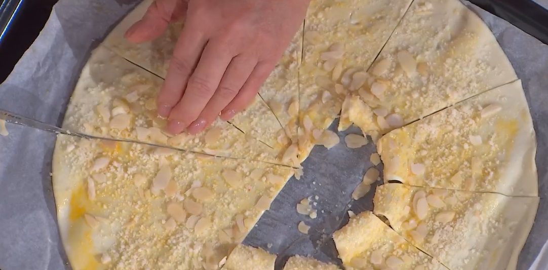 Spennelliamo la pasta sfoglia con l’uovo sbattuto e spolveriamo con formaggio grattugiato e mandorle a lamelle. Dividiamo ogni disco in 12 spicchi: arrotoliamo le punte di ogni spicchio come in foto. Cuociamo in forno caldo e statico a 180° per 12-15 minuti: deve dorare.