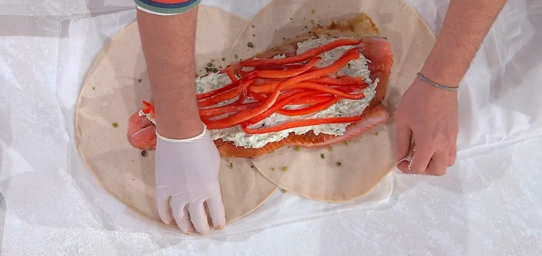 - 1 baffa di salmone da circa 1 kg, 2 confezioni di pasta sfoglia integrale rettangolare, 3 zucchine, 2 peperoni rossi, 30 ml salsa di soia, 400 g formaggio spalmabile quark, 100 g granella di pistacchio, 1 mazzetto di aneto fresco, 1 tuorlo, 2 cucchiai di panna, sale e pepe