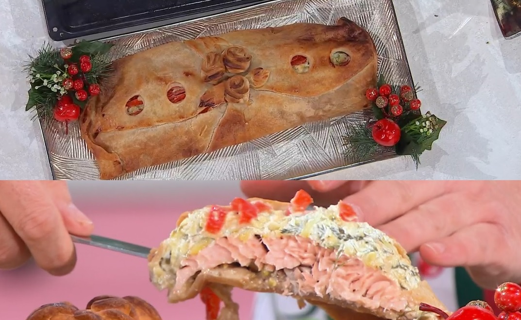 Sovrapponiamo i bordi dei due rettangoli di pasta sfoglia e, al centro, formiamo un letto di granella di pistacchio. Posizioniamo sul pistacchio il filetto di salmone marinato, quindi spalmiamo sopra il composto di zucchine e formaggio, finiamo con dei bastoncini di peperone rosso crudo (possiamo ometterlo). Ripieghiamo i lembi di sfoglia sul ripienom sigillando bene i lati. Sulla sommità, creiamo un foro e spennelliamo tutta la sfoglia con tuorlo sbattuto con panna. Cuociamo in forno caldo e statico a 190° per 40 minuti.