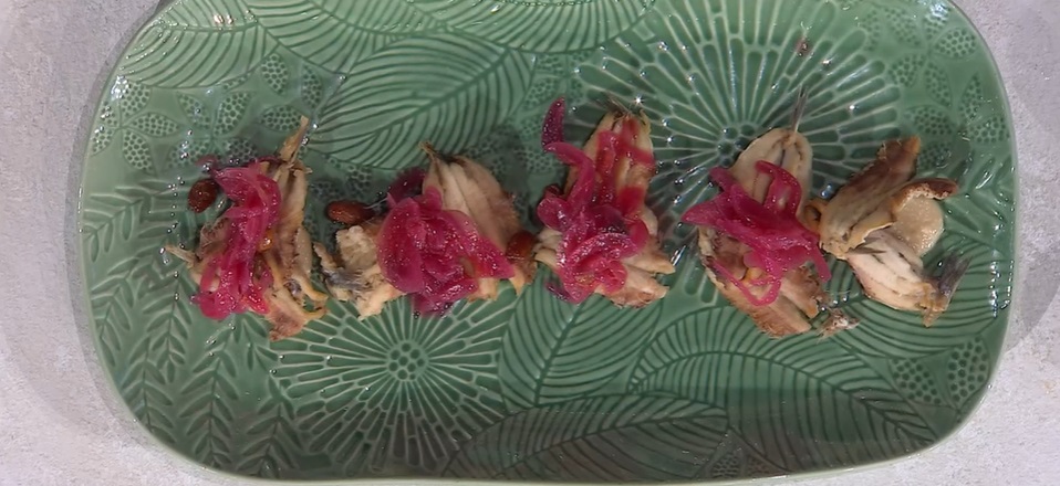 Sul piatto da portata, mettiamo delle gocce di crema di pinoli, sopra le sarde fritte e, ancora sopra, la cipolla cotta nell’aceto.