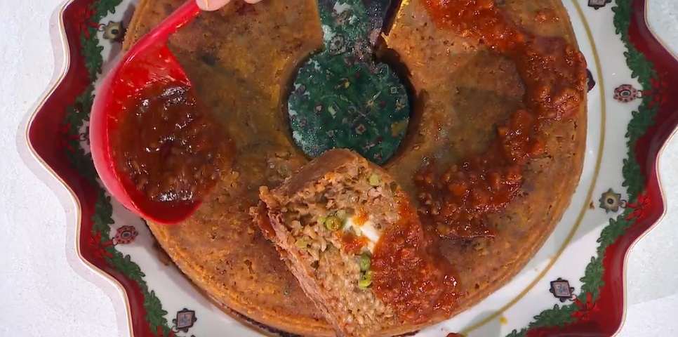 Oliamo e spolveriamo con pangrattato uno stampo a ciambella. Distribuiamo sul fondo metà del risotto, distribuiamo sopra la mozzarella a pezzetti, le uova sode rimaste, i piselli ed un po’ di sugo di maiale. Copriamo con il risotto rimasto e livelliamo. Spolveriamo con pangrattato e finiamo con noci di burro. Mettiamo in forno caldo a 180° per 45 minuti. Serviamo a fette con il sugo rimasto.