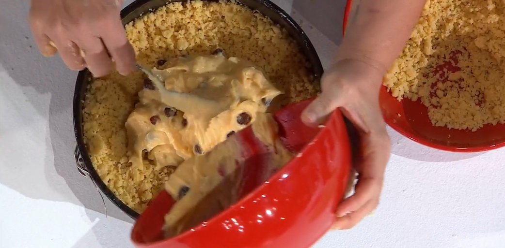 Imburriamo ed infariniamo una tortiera. Distribuiamo alla base circa la metà delle briciole di impasto, senza pressarle, ma . Spalmiamo sopra, con delicatezza, la crema con l’uvetta e copriamo il ripieno con le briciole di impasto rimaste. Per dare un aspetto originale, posizioniamo un coppapasta al centro della torta e distribuiamo intorno le briciole e all’interno del coppapasta i pinoli.