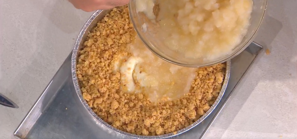 Componiamo: alla base di una tortiera di circa 22-26 cm distribuiamo circa 300 g di briciole d’impasto, senza compattarle. Le facciamo cuocere in forno caldo a 180° per 20 minuti; sforniamo e lasciamo raffreddare.