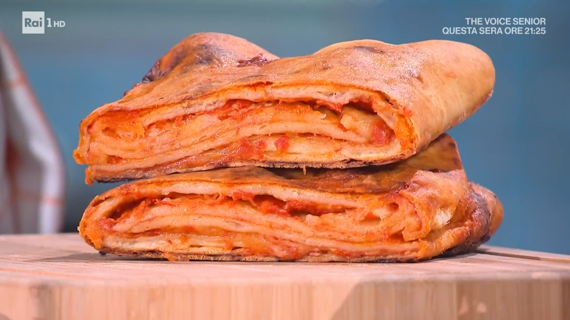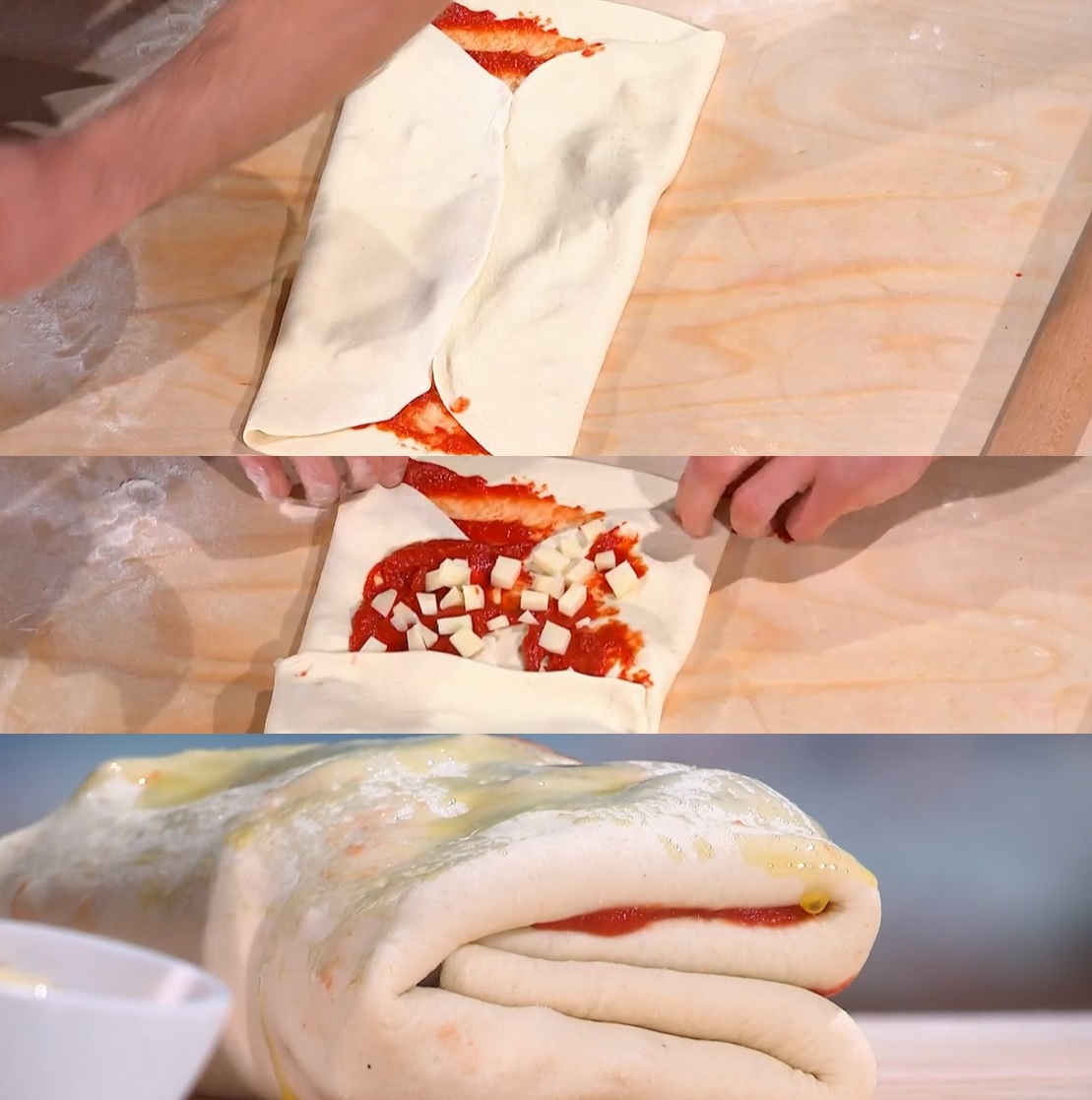 Con il matterello, stendiamo un panetto sul piano infarinato, fino ad ottenere una sfoglia sottile di forma rotonda (dev’essere sottile come fosse pasta all’uovo). Spalmiamo un velo di passata di pomodoro sulla sfoglia, lasciando pulito 1 cm dal bordo. Distribuiamo sopra del caciocavallo a dadini e pieghiamo i lembi esterni, sue due lati, verso il centro. Spalmiamo con altra passata e distribuiamo del caciocavallo. Pieghiamo ancora a libro e ancora condiamo con passata e caciocavallo. Ripieghiamo a metà e finiamo con abbondante olio evo in superficie. Lasciamo lievitare per 1 ora, quindi cuociamo in forno caldo a 220° per 25 minuti.
