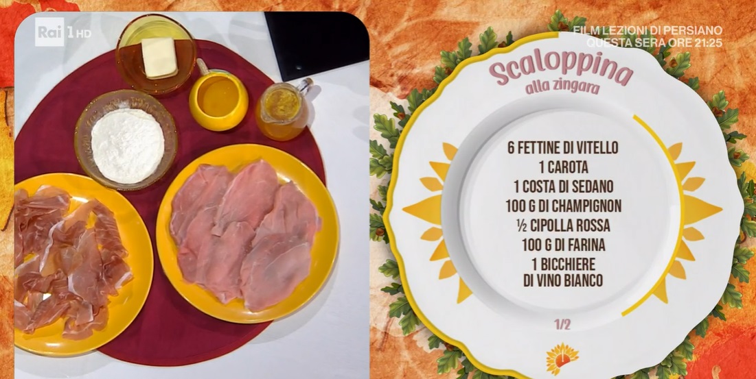 • 6 fettine di vitello, 1 carota, 1 costa di sedano, 100 g funghi champignon, mezza cipolla rossa, 100 g farina, 1 bicchiere di vino bianco, 1 bicchiere di brodo vegetale, 100 g cime di broccolo viola, 80 g prosciutto crudo, 50 g burro, olio evo, sale e pepe