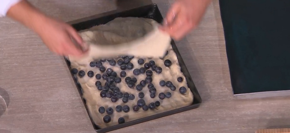 Schiacciamo nuovamente con le mani (il panetto più grande), fino a raggiungere i bordi della teglia. Distribuiamo sopra l’uva nera e spolveriamo con abbondante zucchero. Posizioniamo sopra l’altra sfoglia di impasto e sigilliamo i bordi. Distribuiamo altra uva sulla superficie, schiacciandola un po’. Spolveriamo con altro zucchero e lasciamo lievitare per 2 ore a temperatura ambiente.