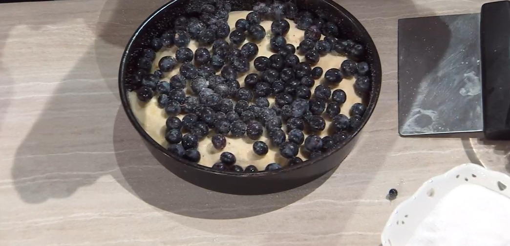 Stendiamo la sfera più piccola all’interno di una tortiera, con le mani. Disponiamo sopra un po’ d’uva e spolveriamo con zucchero semolato. Sul piano, stendiamo un panetto più grande, assottigliando i bordi, e sovrapponiamo il disco ottenuto sull’uva. Distribuiamo sopra altra uva e spolveriamo con altro zucchero. Copriamo e lasciamo lievitare altre 2 ore.